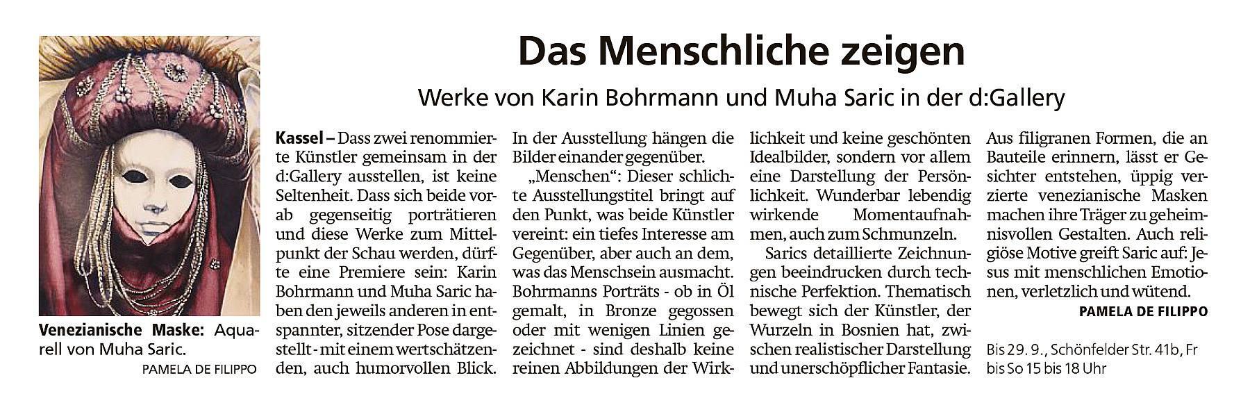 Karin Bohrmann und Muha Saric zeigen in dieser Ausstellung Porträts und Darstellungen von Menschen als Gemälde, Zeichnungen und kleine Skulpturen. Die bildnerische Wiedergabe unterscheidet sich, woraus die Gegenüberstellung dieser faszinierenden Arbeiten ihre Spannung bezieht.