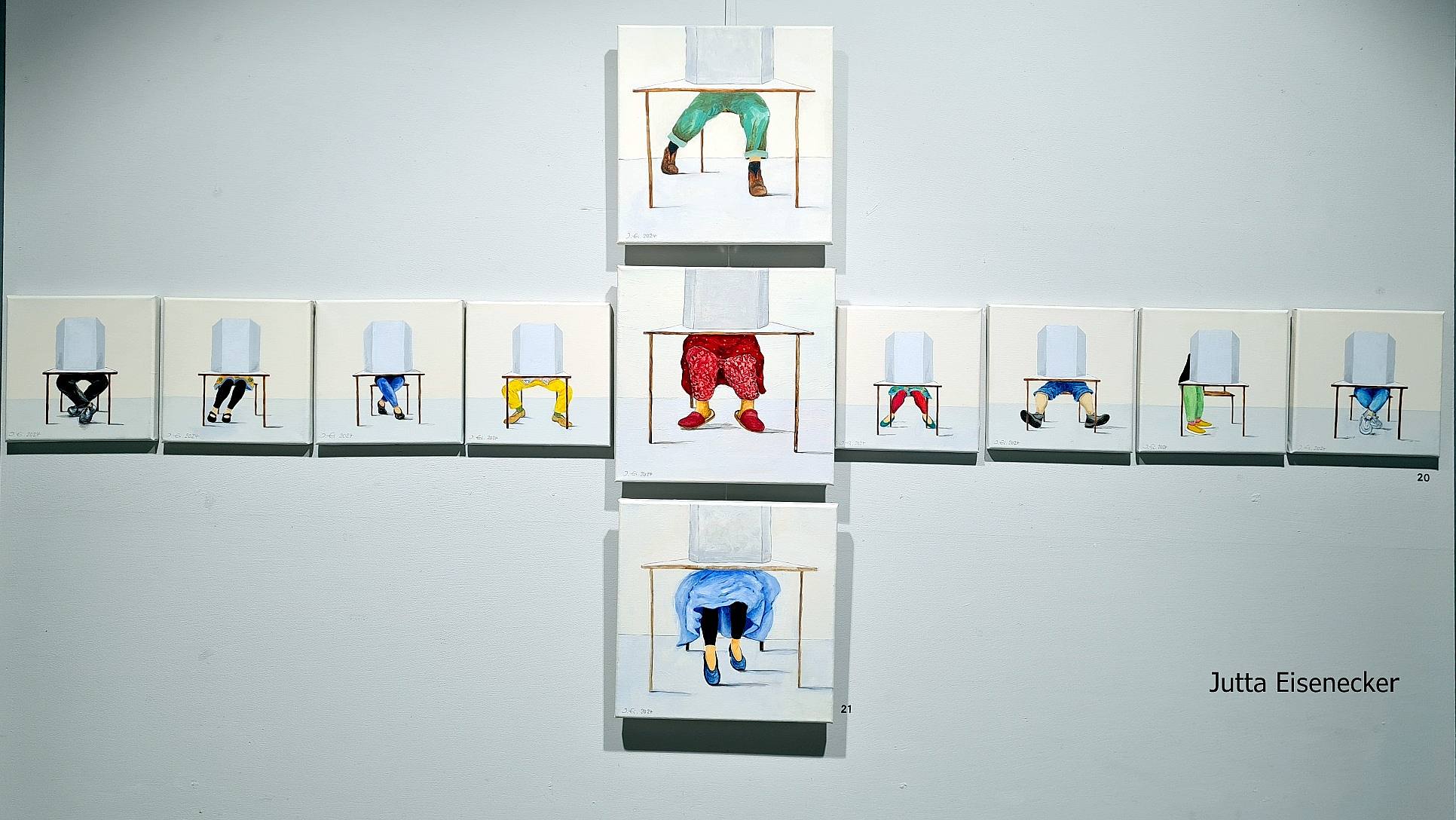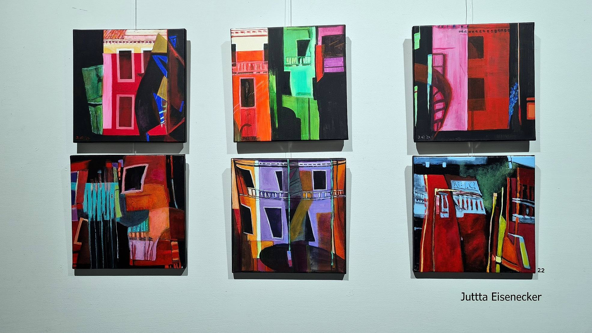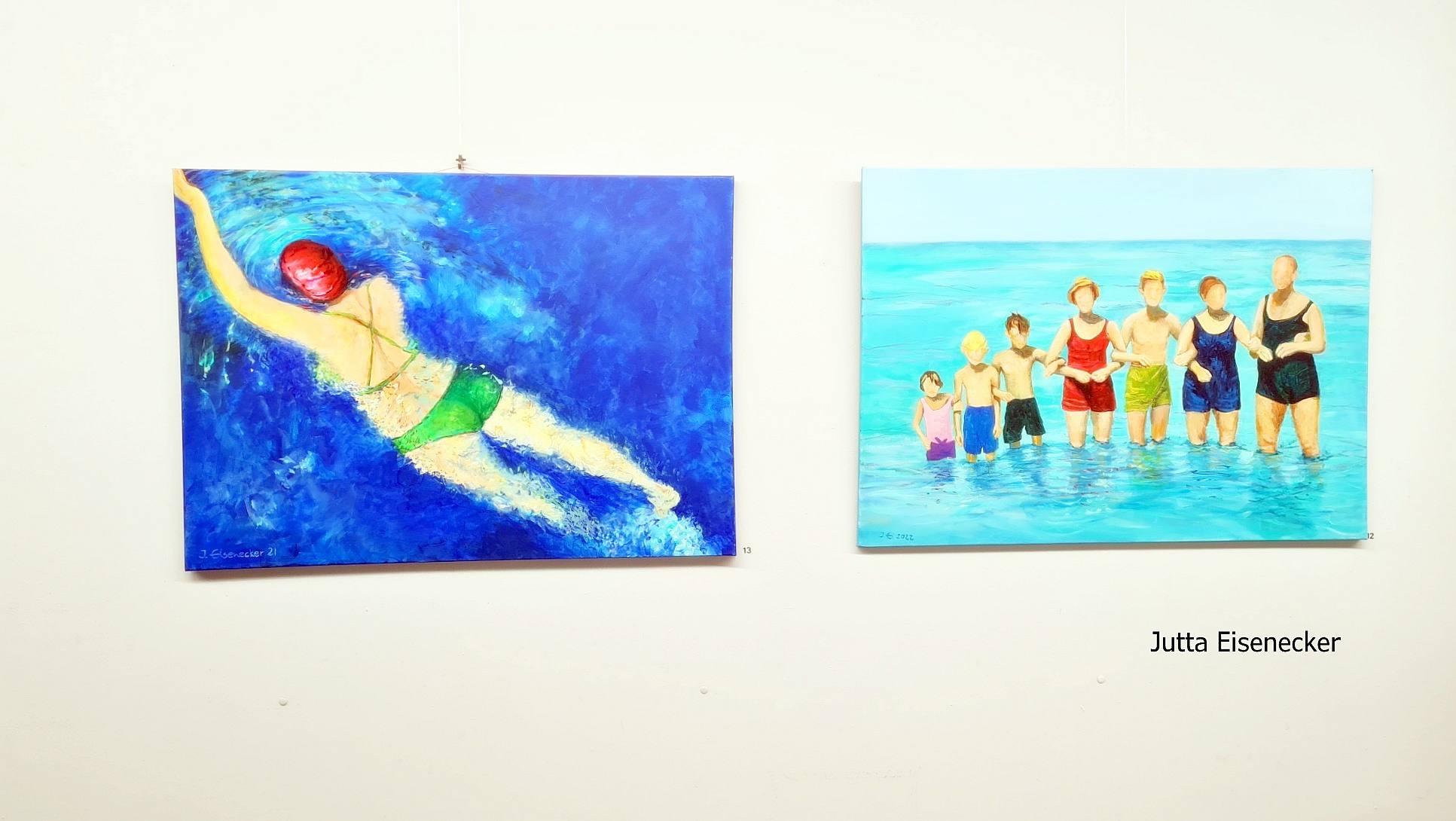 Jutta Eisenecker lässt sich häufig von aktuellen Ereignissen zur Produktion von Bildserien animieren, die sie mit Acryl- oder Ölfarben auf Leinwand oder Papier malt. So haben sie z.B. so unterschiedliche Themen wie: Relikte aus der NS-Vergangenheit, die Fluchtbewegungen 2015, mehrere Sterbefälle in ihrem Umfeld oder die Biennale in Venedig zum künstlerischen – meist gegenständlichen – Verarbeiten angeregt. Hin und wieder reizt es sie aber auch, abstrakte Arbeiten entstehen zu lassen. Eine nicht unwichtige Rolle spielt bei ihrer künstlerischen Arbeit wohl, dass sie – bedingt durch ihren Beruf als Fachärztin für Psychologie und Psychotherapie – eine sehr sensible Wahrnehmung hat. Neben Arbeit und Weiterbildung in ihrem „Brotberuf“ hat sie an zahlreichen Fortbildungen im Bereich der Kunst teilgenommen und eine Reihe von Ausstellungen bestritten.