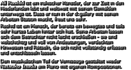Ali hatte sich seinen eigenen Geheimcode ausgedacht, um ihn vor den ständigen Kontrollen und Durchsuchungen der Behörden zu schützen ... “Dies war eine geniale Methode, die Zeit zu vertreiben, die Geschichte zu bewahren und Folter und Tod nach Kontrollen und Kontrollpunkten zu vermeiden. „Er konnte nun den Behörden sagen, dass das lustige Schreiben nur eine abstrakte kreative Technik war, sonst nichts. In Wirklichkeit stellten sie jedoch seine Schmerzensschreie dar, die einen grausamen Krieg führen mussten ... “Schließlich zog Rashid in den Westen, in die Niederlande, in Sicherheit und Freiheit, wo er weiterhin seine Zauberkunst entwirft. Während ich eine endlose Parade von Gemälden durchschaue, schätze und vergesse, bleibt Rashid bei mir und ich kehre immer wieder zu ihnen zurück. Ich habe nicht das Bedürfnis, sie bewusst zu entziffern, und ich glaube nicht, dass wir dazu bestimmt sind. Die Markierungen fühlen sich an wie Wände von Höhlen, deren Texturen mit alten Beschwörungen aus Jahrtausenden versehen sind. Sie werden jedoch durch den reinen Modernismus transformiert, der auf die Geschichte anspielt, aber eine kreative und spirituelle Erfindung der Gegenwart bleibt. So viele Künstler, auch ich, empfinden ihre Praxis als überlebenswichtig. Wir sagen oft: "Ich mache es, weil ich muss." Vielleicht verkörpert Rashids Arbeit dieses Konzept wörtlicher, als wir es jemals selbst erleben werden. Als solches ist seine faszinierende abstrakte Kunst nicht nur ein Symbol der Erlösung, sondern eine Aufzeichnung davon.