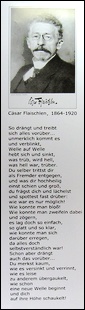 So drängt und treibt sich alles vorüber... unmerklich kommt es und verblinkt, Welle auf Welle hebt sich und sinkt, was trüb, wird hell, was hell war, trüber. Du selber trittst dir als Fremder entgegen, und was dir hochheilig einst schien und groß, du frägst dich und lächelst und spottest fast drüber: wie war es nur möglich! wie konnte man bloß! Wie konnte man zweifeln dabei und zögern, es lag doch so einfach, so glatt und so klar, wie konnte man sich darüber erregen, da alles doch selbstverständlich war! Schon aber drängt auch das vorüber... du merkst kaum, wie es versinkt und verrinnt, wie es leise zu anderem übergaukelt, wie schon eine neue Welle beginnt und dich auf ihre Höhe schaukelt! Cäsar Flaischlen (1864-1920) |