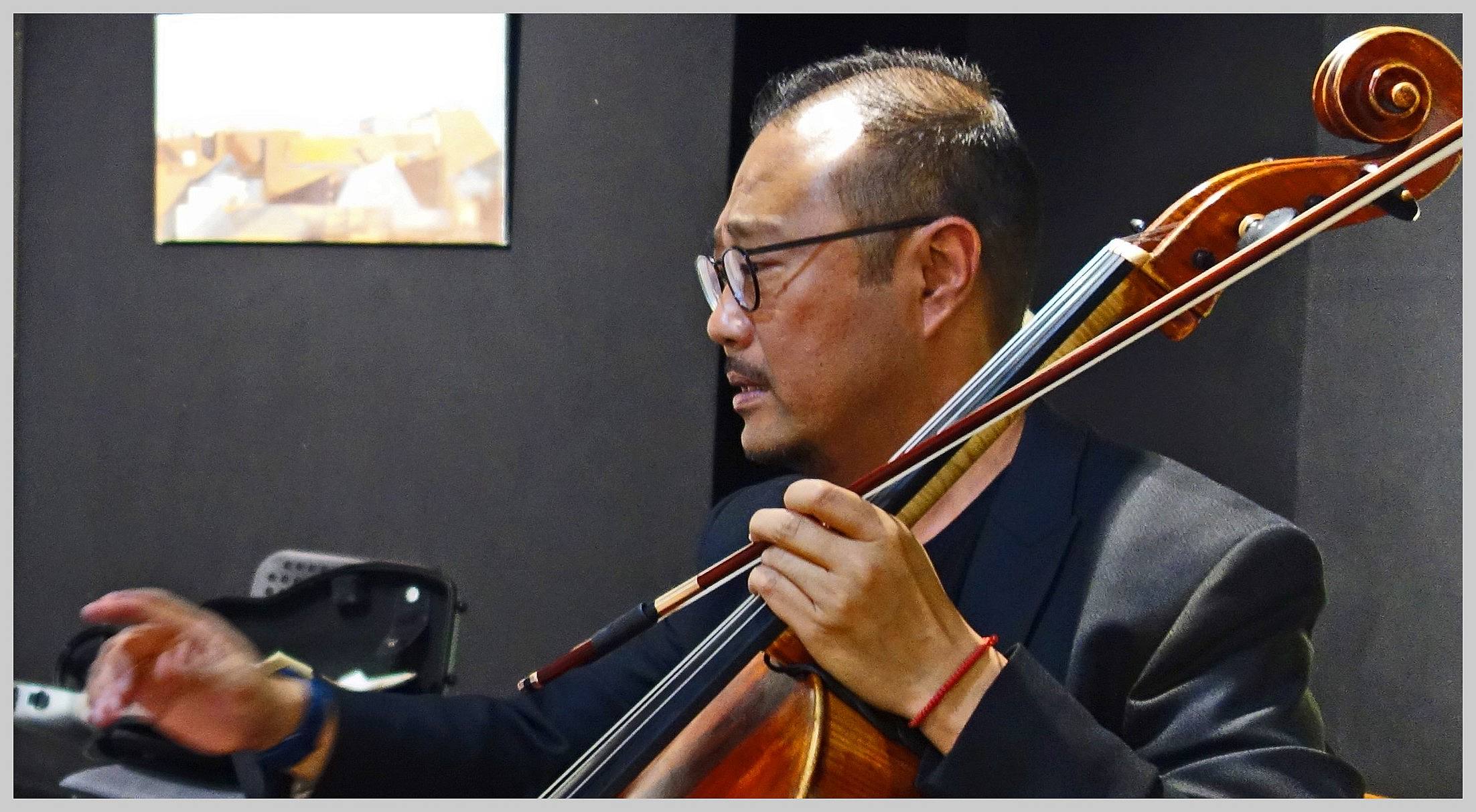 Gang Wang am Violoncello bietet den musikalischen Rahmen für die Ausstellungseröffnung "MENSCHEN"